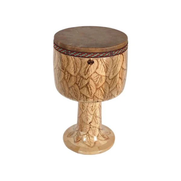The Helmi Sukhte-Kari Tonbak is a Persian goblet drum decorated using a traditional burnt-engraving technique. This method creates dark, detailed patterns on the wooden body, giving the instrument a distinctive and artistic appearance. Besides its aesthetic appeal, this tonbak is recognized for its deep bass, crisp high tones, and excellent response, making it suitable for players of all levels.